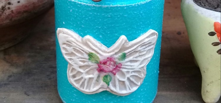 Ayudándote con la pinza, envolver un alambre alrededor del cuello del frasco, formando dos orejitas y cerrar en el frente. Pasar luego otro alambre formando una manija para colgar.