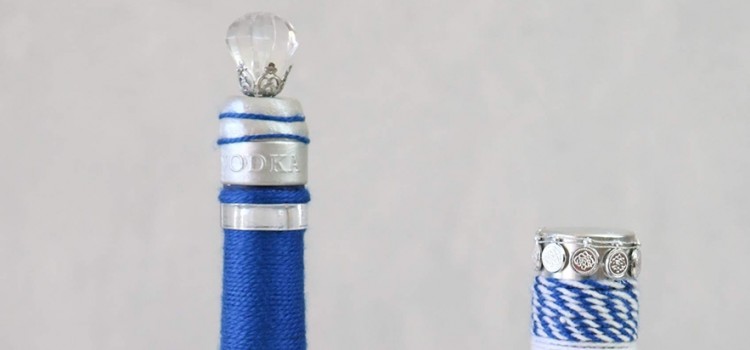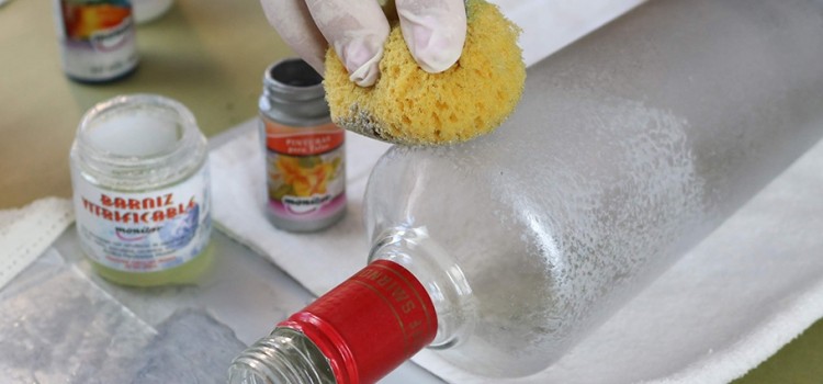 Mezclar por partes iguales barniz vitrificable y pintura para tela perlada plata. Con esponjita, poncear cubriendo la botella. Dejar secar. Dar otra mano.