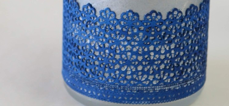 Preparar la puntilla, poniendo el sello y rociándolo con espray de cocina (poco) Aplicar con espátula la pintura 3D blanco. Quitar todo excedente. Dejar secar y retirar. Tomar la puntilla que se usará y cortarla del tamaño de la botella. En algunas zonas que se quieran tapar, se corta el motivo de la puntilla a conveniencia.