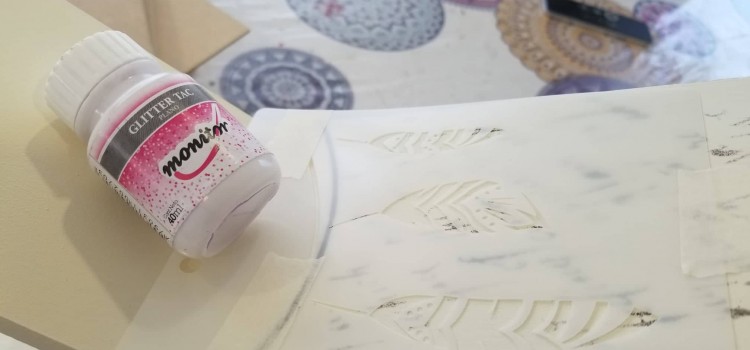 en otro sector, pintar con acrílico y sobre el mismo y un estencil, colocar Gliter Tac 3D.