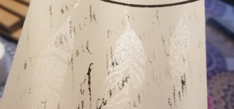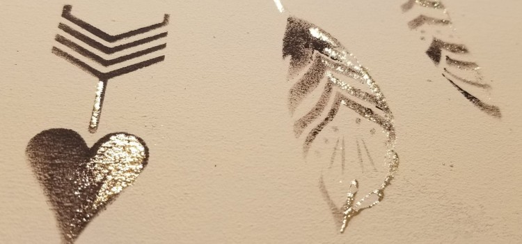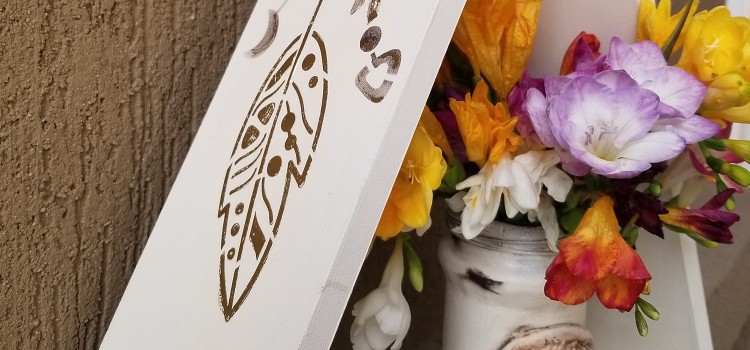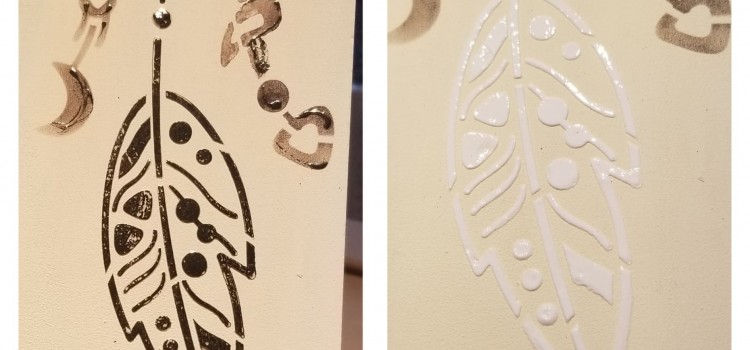 En la base de la repisa con estencil y acrílico pintamos las plumas, solo por sectores colocar el Glitter y luego el Foil.