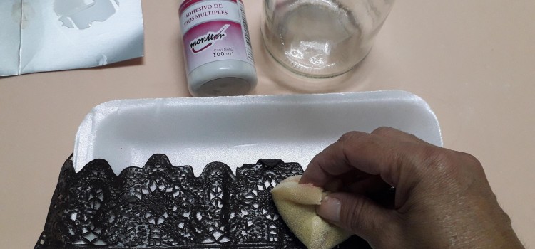 Desmoldar la puntilla y colocar Adhesivo de Usos Múltiples con esponja del lado del revés. Dejar secar hasta que tome punto mordiente.