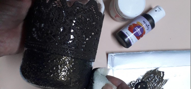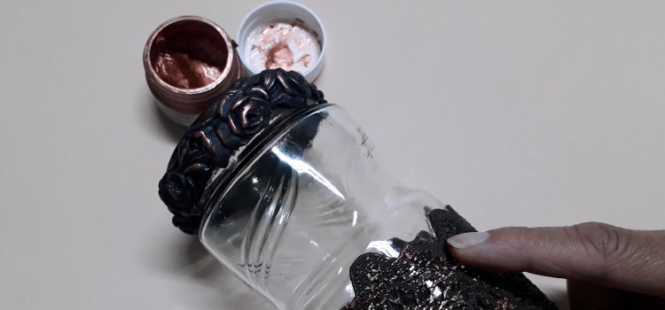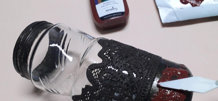 Mezclar Barniz Vitrificable en partes iguales con Acrilico Negro Dorado y pintar la parte superior e inferior del frasco; dejar secar y dar una segunda mano.