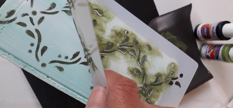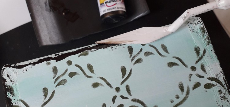 En uno de los laterales trabajar con un stencil y técnica de pincel seco con la mezcla de Acrílico Decorativo Negro y Verde Bosque Claro.