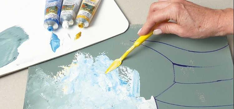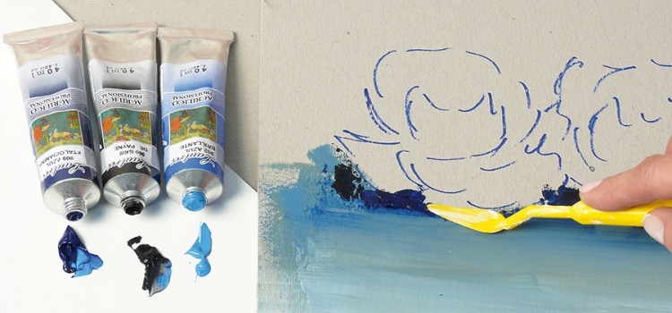 Transferir el diseño. Colocar en la paleta los colores Blanco, Azul Brillante y Ocre. Colocar un poco de Blanco y de Azul brillante con espátula y sólo unos toques de Ocre. Con la misma espátula ir mezclando sobre el trabajo de modo que quede un fondo con profundidad y movimiento