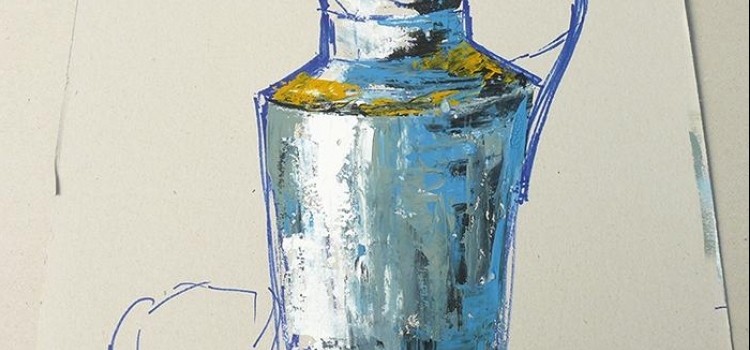 Con la espátula, siguiendo con los colores hasta ahora usados, y agregando un pizca de Amarillo oro, cubrir la zona de la jarra, alternar movimientos de espátula horizontales con verticales, de modo que vayan siguiendo las formas de la jarra. Observar bien el objeto en el modelo terminado y en la foto de este paso para seguir los movimientos de espátula.