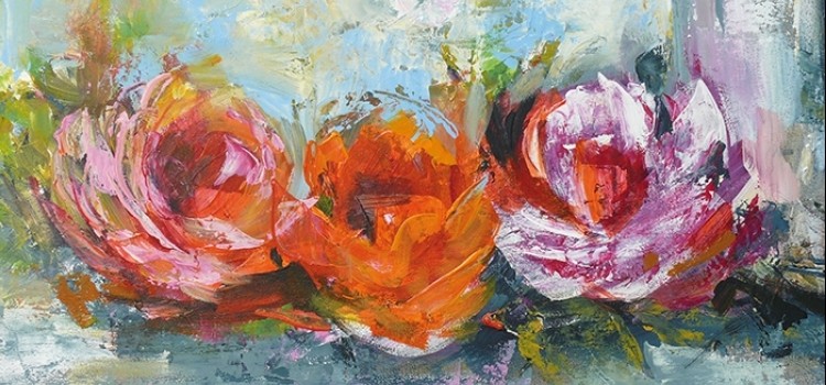 Agregar a nuestra paleta los colores Azul Ftalocianina y Gris de Payne. Con movimientos horizontales y siempre con espátula, colocar los colores debajo de las flores y de la jarra, iluminando la mesa y oscureciendo a punta de espátula los sectores cercanos a los objetos para despegarlos del fondo