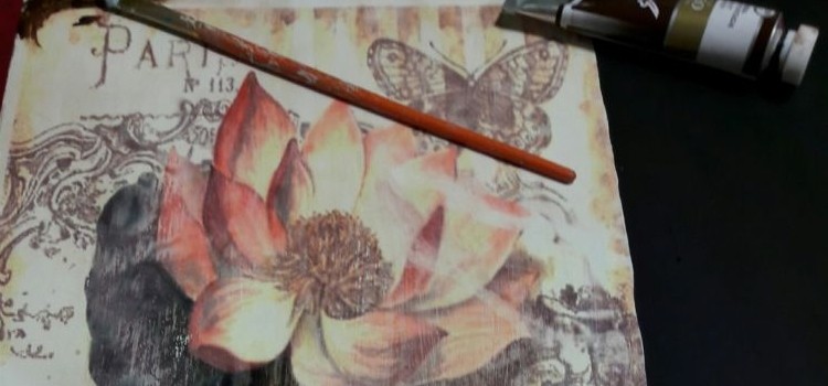Con un pincel de cerda viejo ensuciar los contornos de la imagen con óleo Tierra Sombra Tostada. De inmediato con la yema del dedo o con un trapo, esfumar.