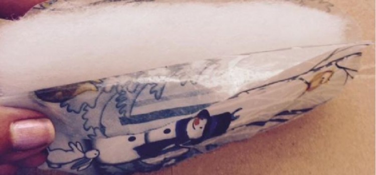 Cortar 2 trozos de guata un poco más chico que el molde. Colocando uno, entre las dos partes de adelante y pegándolos con Adhesivo de usos múltiples, dejando orear, antes de unir.