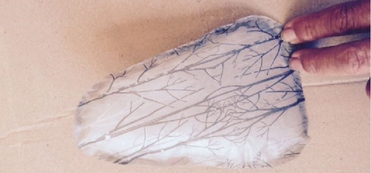 Sobre un nylon, tomar papel de cocina (el absorbente) que tiene dibujo, y con un pincel ancho pasar EnTela, poca cantidad y sin repasar encima para conservar el diseño del papel. Dejar secar.