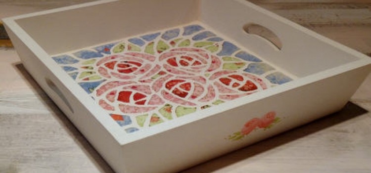 • Pintar la bandeja de fibrofácil con base acrílica blanco, dejar secar y lijar con lija 240