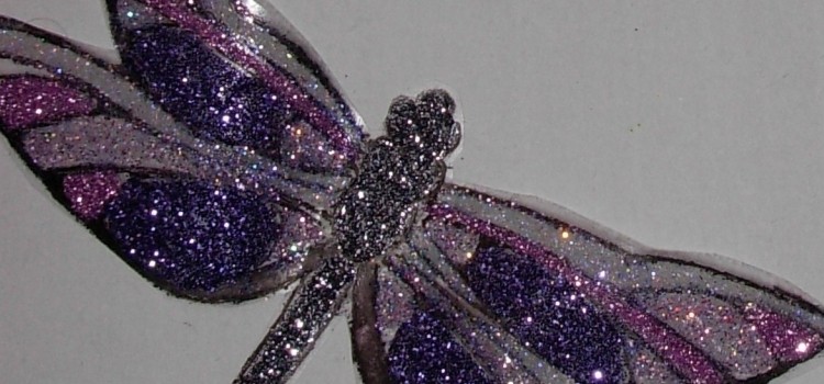 Cortar el celofán dejando 2 o 3 cm alrededor del tamaño de la libélula. Colocar el diseño de la libélula (o mariposa) debajo del celofán . Calcar con el marcador la forma y cada una de las celdillas del insecto. Reforzar las zonas de los bordes y todo lo que se quiera destacar pasando nuevamente el marcador. Dejar secar 48hs .Colocar el celofán arriba de una madera a la que se le aplicó pegamento TAC para fijarlo momentáneamente, cubrir alrededor de la libélula para que luego no se pegue el glitter al pegamento de la madera.
