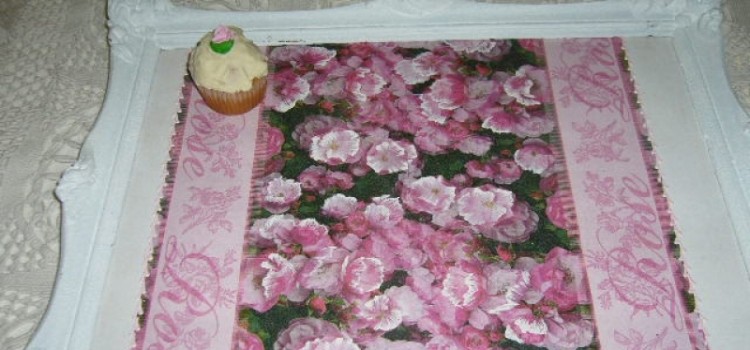 b- realizar un decoupage en el centro de la bandeja , para evitar que queden arrugas colocar mod podge textil sobre la base, aplicar la servilleta y con un film suavizar la superficie, una vez seco, lijar
