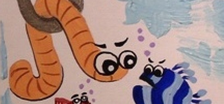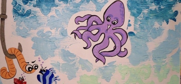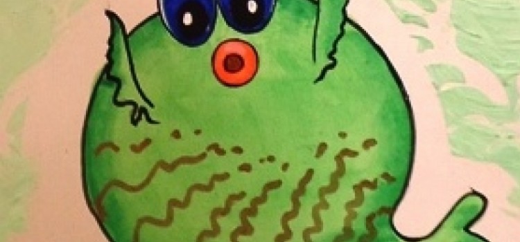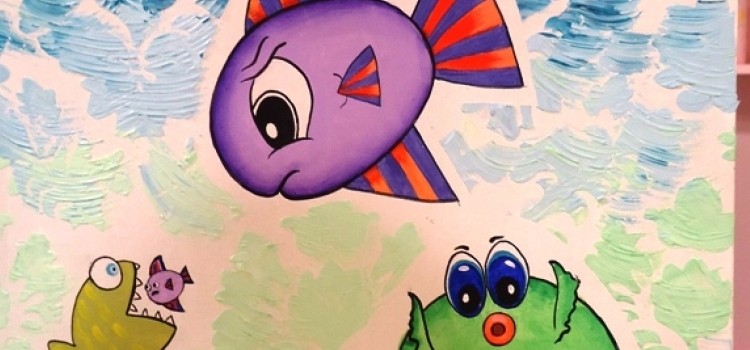 Pez que quiere comer al hijito: cuerpo verde porcelana; escamas aclarando el color con blanco; ojos: celeste y blanco el centro y puro en el borde. Delinear con negro en todo el contorno.