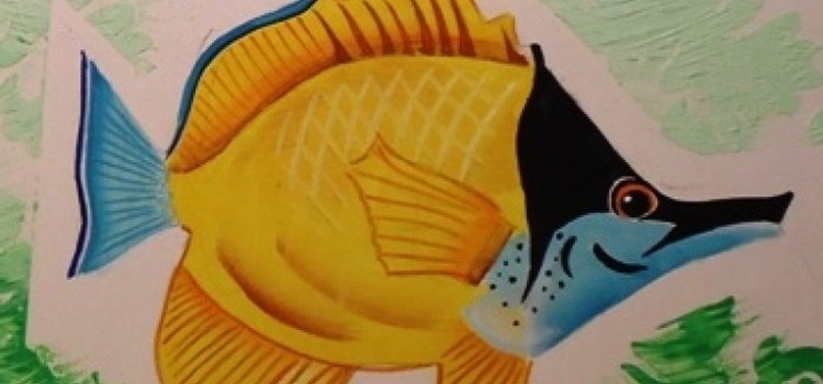 cuerpo: amarillo, luego con liner y blanco el enrejado y las manchas con Sienna natural; aletas: amarillo, luego con Siena las rayas y con turquesa el borde de la aleta superior; cola: turquesa más blanco, línea en azul naval, luego rayas y sombra con turquesa; ojos: blanco y naranja; parte como de trompa: en negro y turquesa mas blanco.