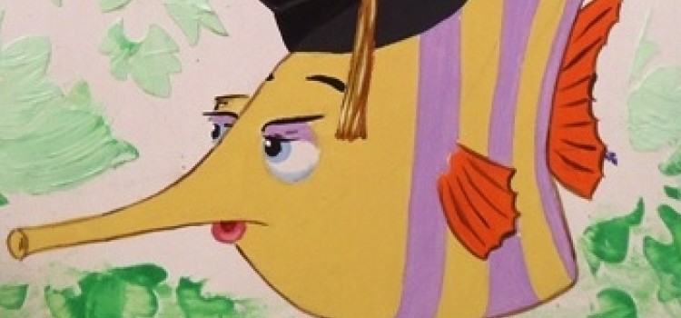 cuerpo: acrílico color lirio; cola y aletas: rayadas en violeta y naranja luego aclarar el naranja con blanco y dar luces en el borde; ojos: blanco y negro. Luego hacer media carga con violeta alrededor del cuerpo Con liner y negro aguado, hacer las cejas y la boca; luego delinear todos lo bordes.