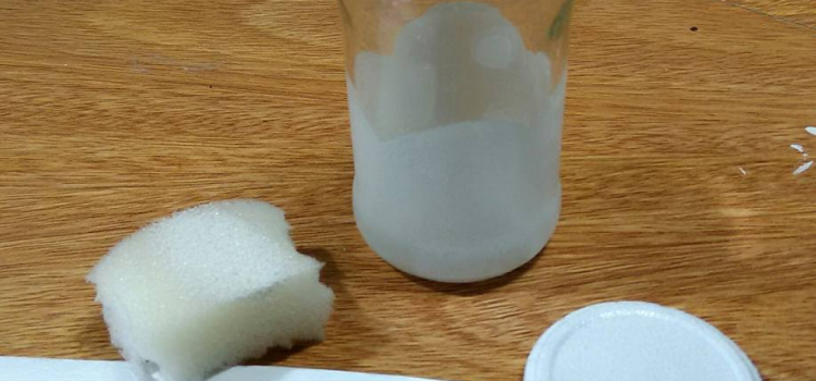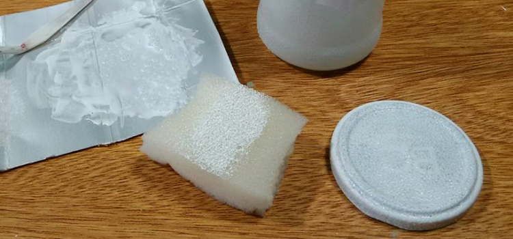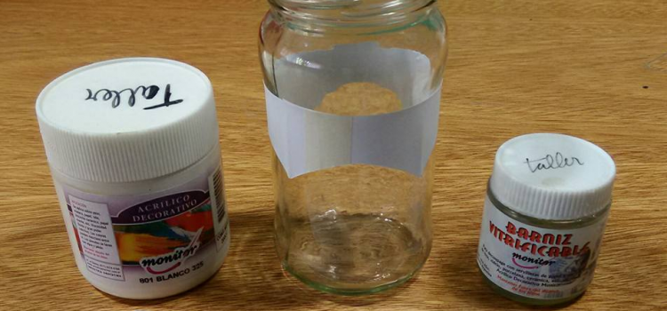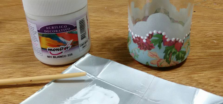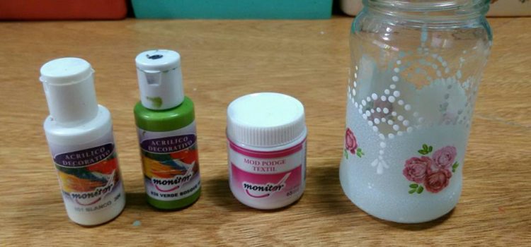 Aparte, mezclar partes iguales de acrílico blanco y barniz vitrificable. Pintar con esto la tapa del frasco utilizando esponja. Secar.