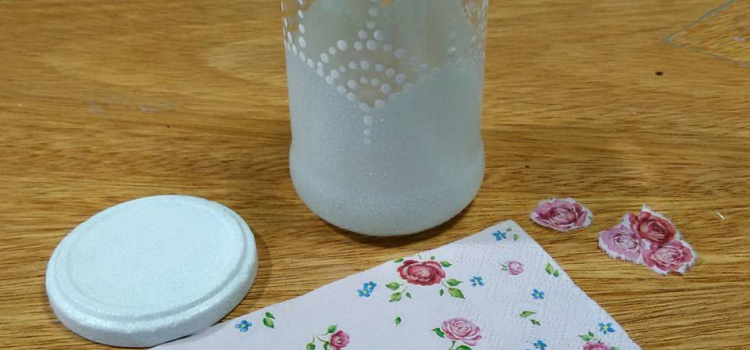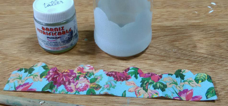 Recortar pequeños diseños de una servilleta y pegar sobre el frasco con barniz vitrificable. Secar.
