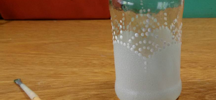 Al sobrante de esta pintura, agregarle unas gotas de agua para aligerarla y con el cabo del pincel, hacer puntos en el frasco para completar la decoración.